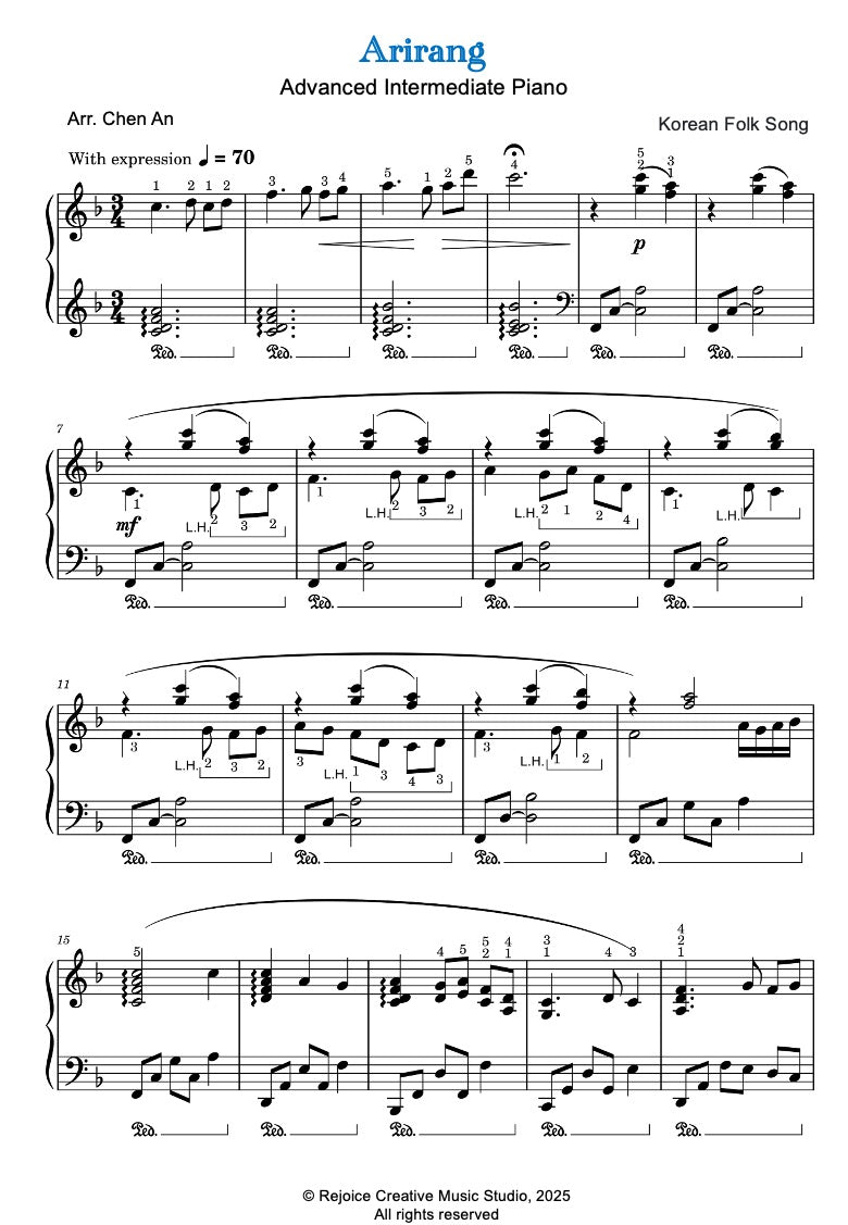 This is an arrangement of Arirang for the advanced intermediate pianist. It is a beautiful Korean Folk Song. This arrangement consists of different accompaniment and layering. You can listen to the full version here.