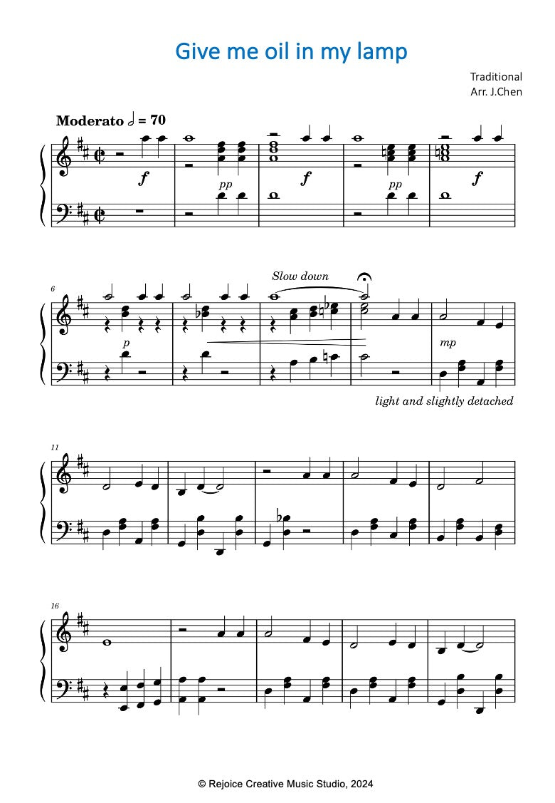 Give Me Oil In My Lamp is a traditional tune. This arrangement is primarily for the early intermediate pianist. You could take a listen to it here.