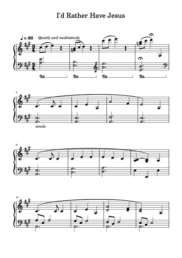 This is an arrangement of I'd Rather Have Jesus for the intermediate pianist. You can listen to the full version here.