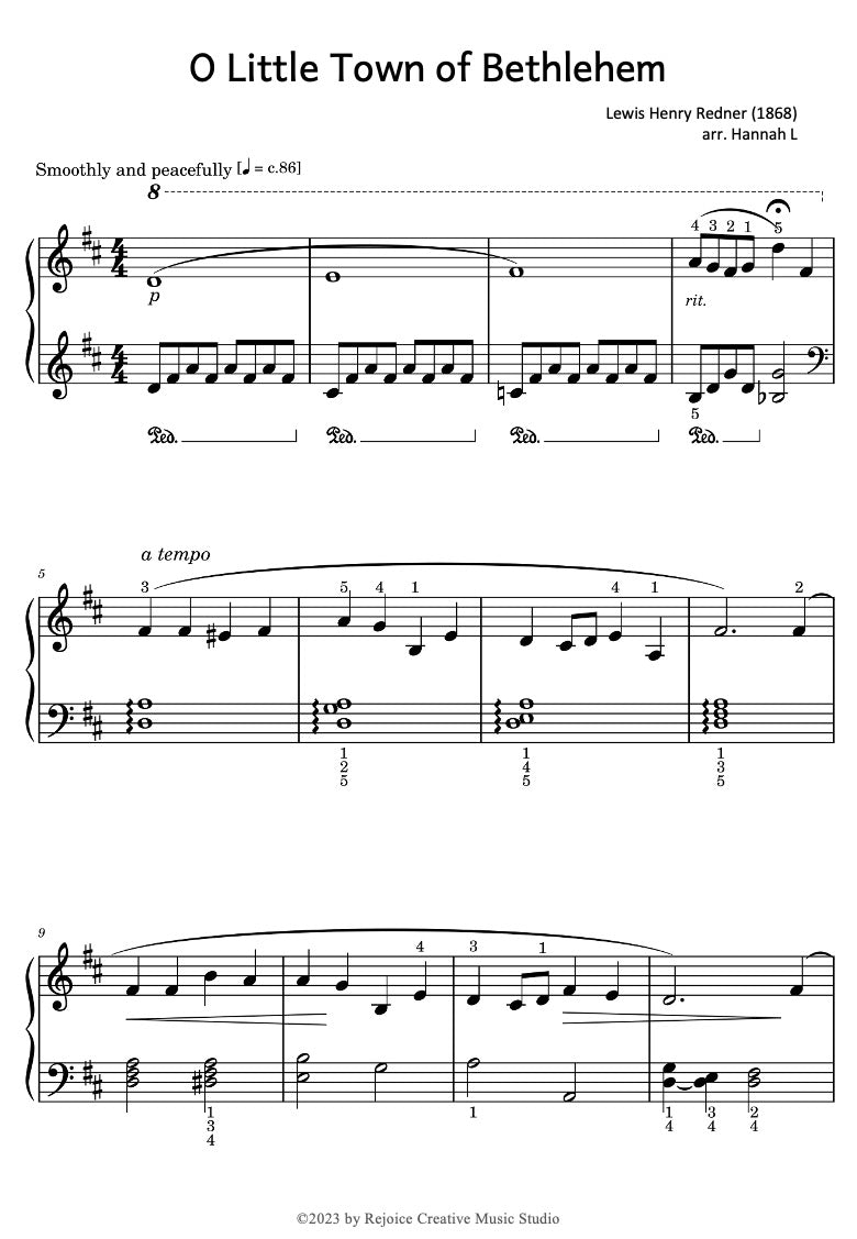 This is an arrangement for the early intermediate pianist. It is written for 2 verses, in D major. The first verse is mainly chordal while the second verse is fuller in texture.
