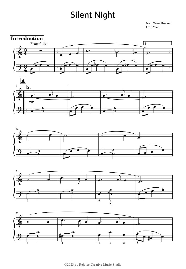 Silent Night is a Christmas classic written by Franz Xaver Gruber. This arrangement is primarily for the late beginner pianist. Check out the arrangement here.